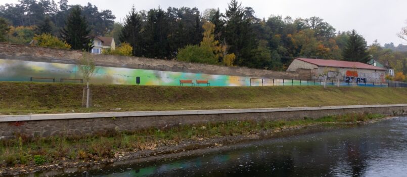 Koncept jemných tahů štětcem imitující zvuky řeky přinesla nevidomá umělkyně Michaela Mráčková pro výzdobu protipovodňové stěny na Táborského nábřeží. V těchto dnech už je velkoformátová malba dokončovaná včetně ošetření anti-graffiti nátěrem.